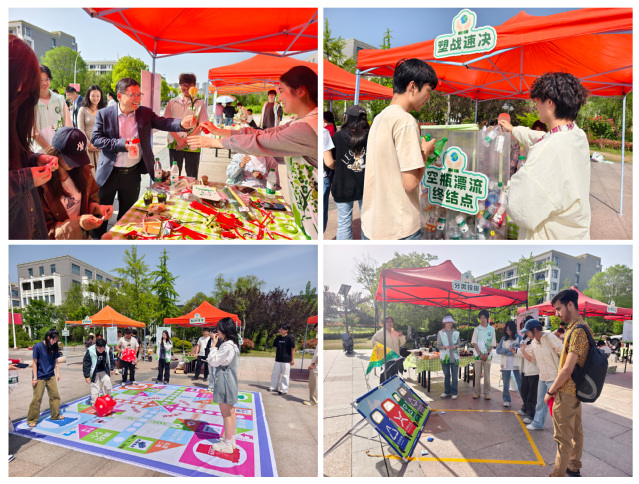 活动现场划分为“科普展示区”与“创意互动区”,构建多维度环保体验空间。科普区通过图文展板、实物模型等系统展示地球生态现状、环境污染类型与危害、生态循环与碳中和等环保知识,让师生们对环保有了更直观、深入的认识。互动区在巨型“环保飞行棋”棋盘上,参与者通过回答碳中和问题闯关;“垃圾分类沙包投掷”将运动竞技与知识挑战结合,让大家在轻松愉快的氛围中学习环保知识,解锁环保新玩法。