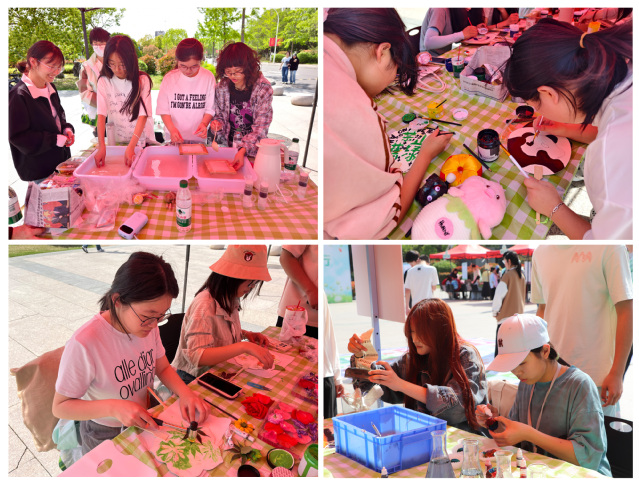 “重塑地球”活动区是创意与环保结合的典范。参与者将废纸浆塑成的星球胚胎嵌入奇亚籽,用食用色素绘制的陆海轮廓,见证“纸浆降解-种子萌发”的生命循环,感受废弃物重新焕发生机的过程。标本书签制作区堆满校园落叶与干花,员工用滴胶封存自然之美;手绘帆布包区域则提供环保标语模板,让环保宣言“背”上肩头,成为行走的环保宣传。此外,古法造纸与植物拓染、扎染等活动也吸引了众多师生参与,大家在体验传统工艺的同时,也感受到了环保与艺术的融合。市集内还将生态保护融入多元体验。设置“谁在悄悄和我们告别”濒危动物艺术共创项目,同学们用环保颜料为黑白线稿填色,每涂亮一只动物,就像点亮一份守护承诺,在创作中增强了对濒危动物的保护意识。
