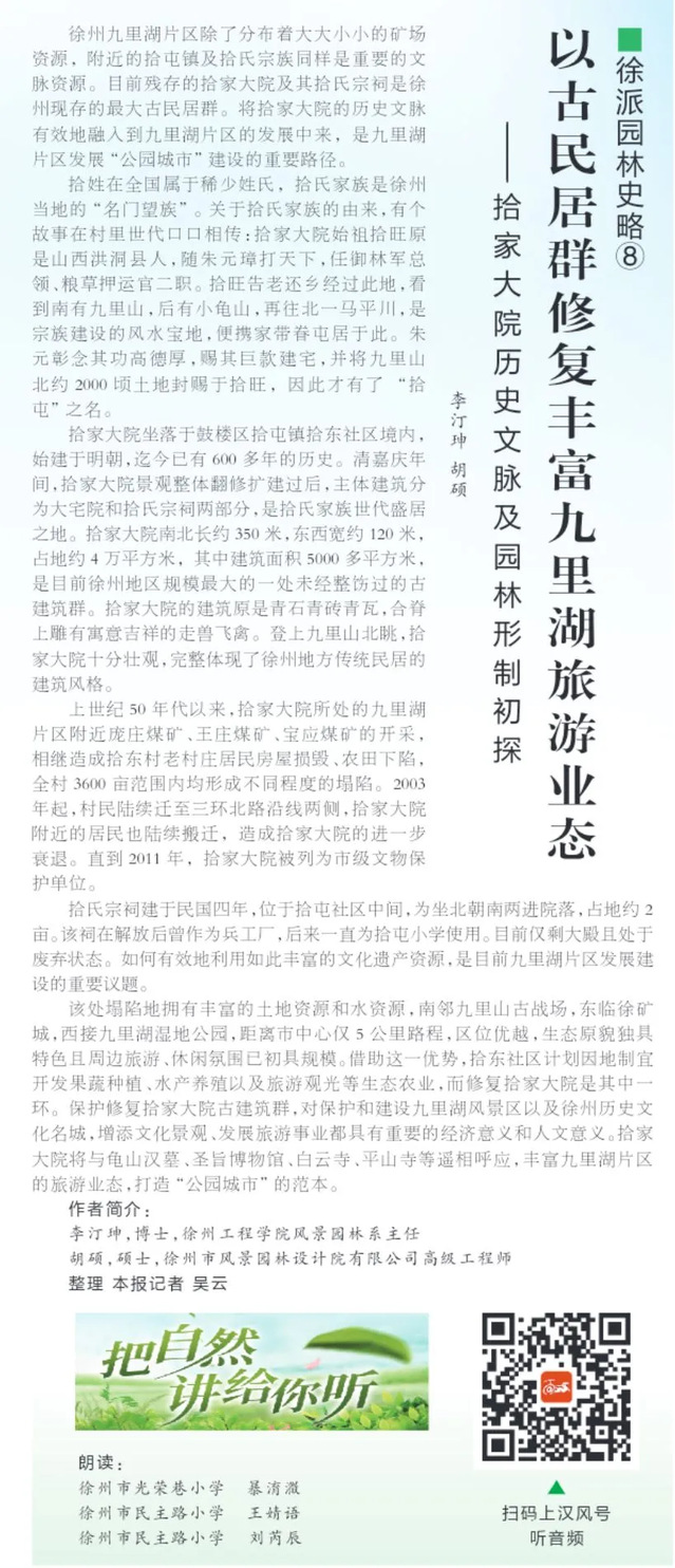 拾氏宗祠建于民国四年,位于拾屯社区中间,为坐北朝南两进院落,占地约2亩。该祠在解放后曾作为兵工厂,后来一直 拾屯小学使用。目前仅剩大殿且处于废弃状态。如何有效地利用如此丰富的文化遗产资源,是目前九里湖片区发展建设的重要议题。该处塌陷地拥有丰富的土地资源和水资源,南邻九里山古战场,东临徐矿城,西接九里湖湿地公园,距离市中心仅 5公里路程,区位优越,生态原貌独具特色且周边旅游、休闲氛围已初具规模。借助这一优势,拾东社区计划因地制宜开发果蔬种植、水产养殖以及旅游观光等生态农业,而修复拾家大院是其中一环。保护修复拾家大院古建筑群,对保护和建设九里湖风景区以及徐州历史文化名城,增添文化景观、发展旅游事业都具有重要的经济意义和人文意义。拾家大院将与龟山汉墓、圣旨博物馆、白云寺、平山寺等遥相呼应,丰富九里湖片区的旅游业态,打造“公园城市”的范本。