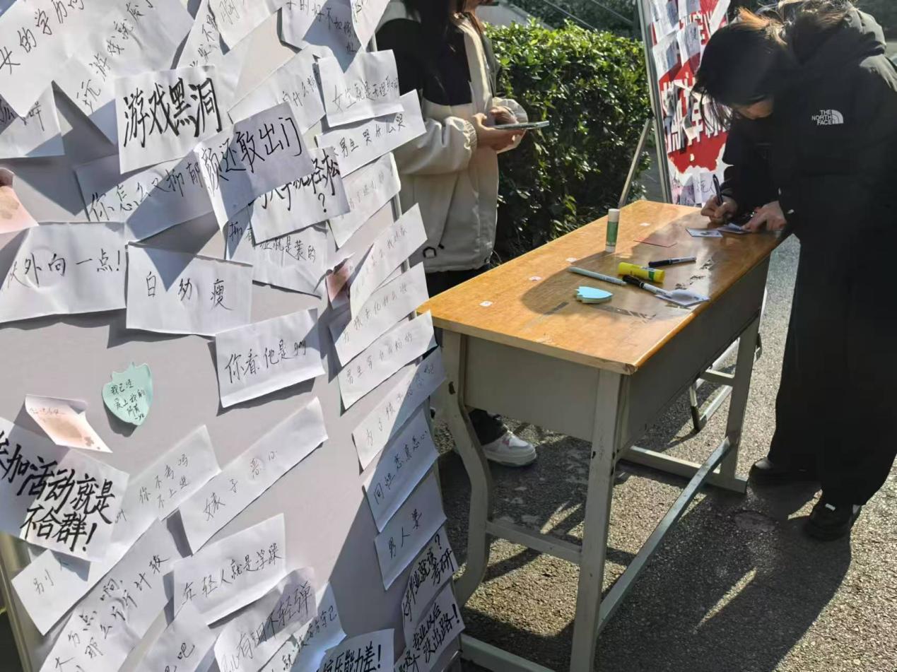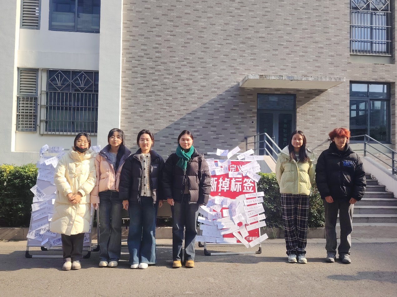 活动伊始,志愿者将贴满“学渣”、“乖乖女”、“叛逆少年”、“书呆子”、“公主病”、“死宅男”等带有歧视性或片面性的标签牌展现在大家面前,同学们依次走向前,勇敢将牌上刻板的标签撕下,将歧视和偏见的无形标签撕下,用行动展示出对恶语人身攻击的强烈抵制。接着,参与者撕下标签,或写下对刻板标签的反击,或写下自己关于这个标签的见解,或分享自己的故事。用“拥抱阳光”、“自信明媚”、“聪明善良”、的话语将立牌点缀,这些话语不仅仅是同学们对社会歧视现象的反对,同时也代表着对自身的接纳与认同,鼓励着我们自信满满地生活、成长。